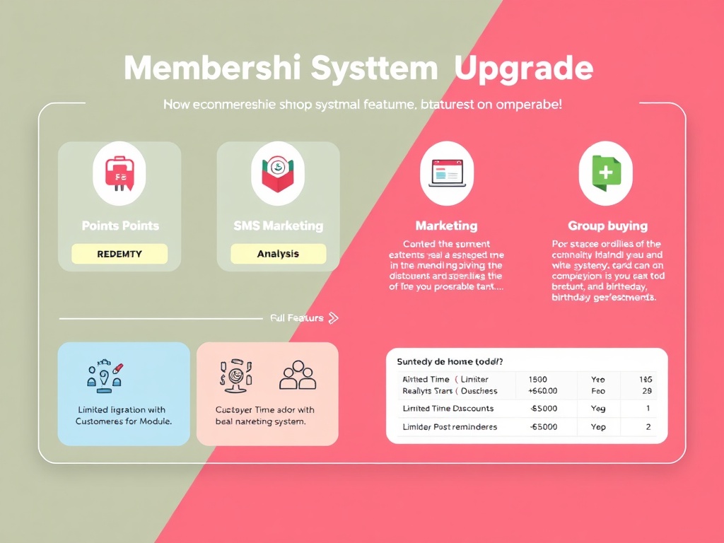 原有商城系统升级 + 新增会员积分兑换 + 短信营销模块。积分商城与线下系统同步,客户行为分析自动推荐商品,支持限时折扣/拼团/生日提醒等营销机制